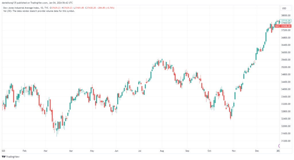 Chart 3: Dow Jones Industrial Average price chart for 2023 (https://www.tradingview.com/x/W315ih4p/)