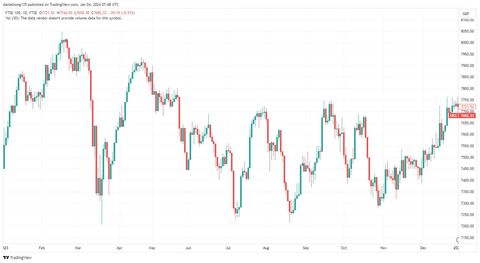 Chart 5: FTSE 100 price chart for 2023 (https://www.tradingview.com/x/iaxBQpo1/)