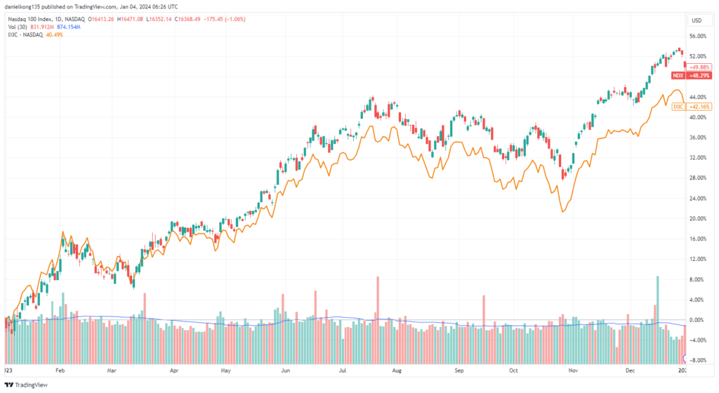 Starting from January 2023, the chart illustrates a consistent upward trajectory for both the Nasdaq 100 and the Nasdaq Composite indices, signalling a cumulative appreciation in their price across 2023. As the year progressed, particularly from November, this positive momentum intensified, suggesting a strong bullish sentiment among investors.