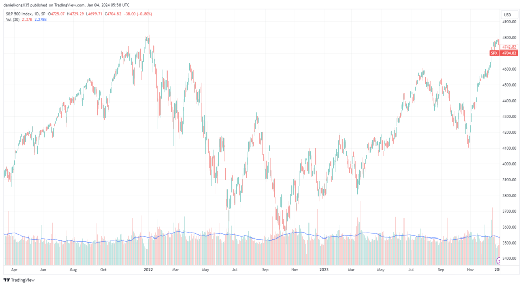 In 2023, the S&P 500 Index displayed a pattern of volatility with growth and overcoming declines in the middle of the year to close at a higher level. Periods of sharp rises and falls throughout the year indicated a reactive market to varying global economic events (Israel-Hamas conflict and the US Federal Reserve Interest Rate Hikes). Despite these fluctuations, the overall trend appears to be positive, with the index ending the year at a higher point than where it started.
