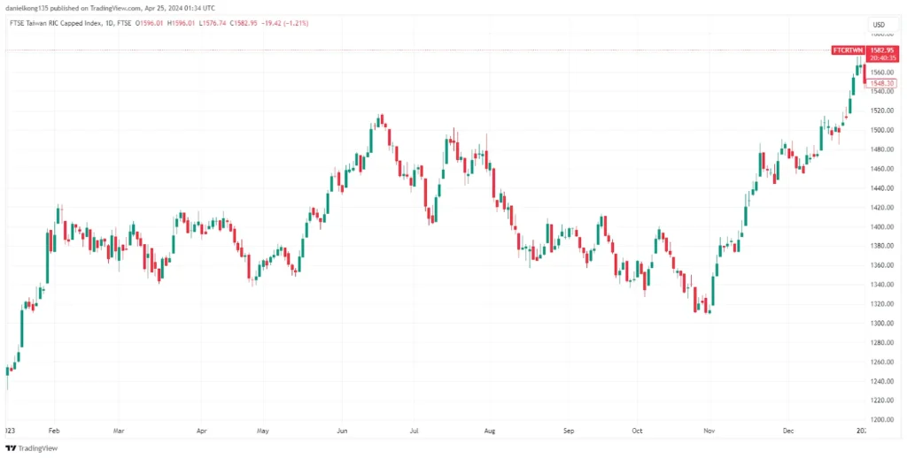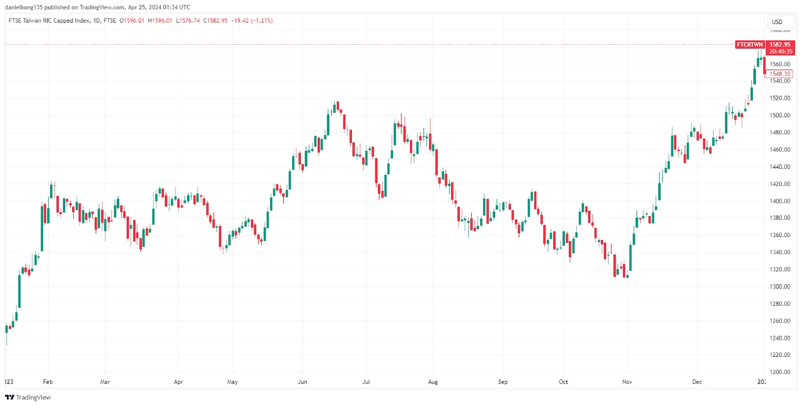 Chart 7: FTSE Taiwan RIC Capped Index price chart for 2023 (https://www.tradingview.com/x/ZtyAQv8i/