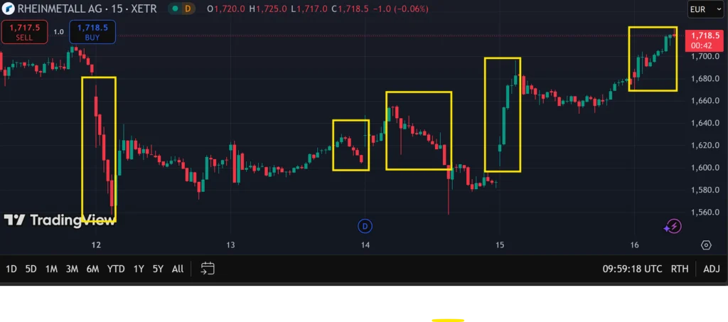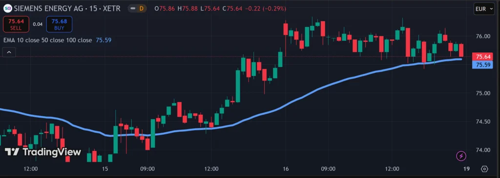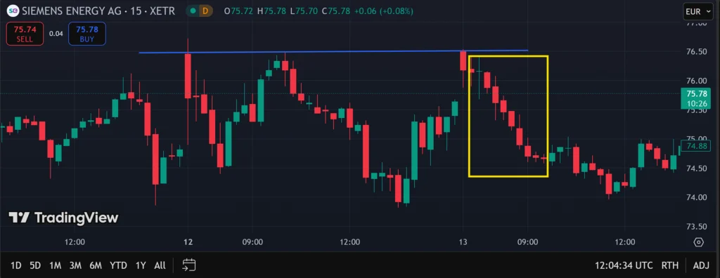 The screenshot above shows the 15-min chart Siemens Energy AG. The choppiness of the candlesticks make it difficult to discern which way the price is going, especially towards the right-half of the chart.
