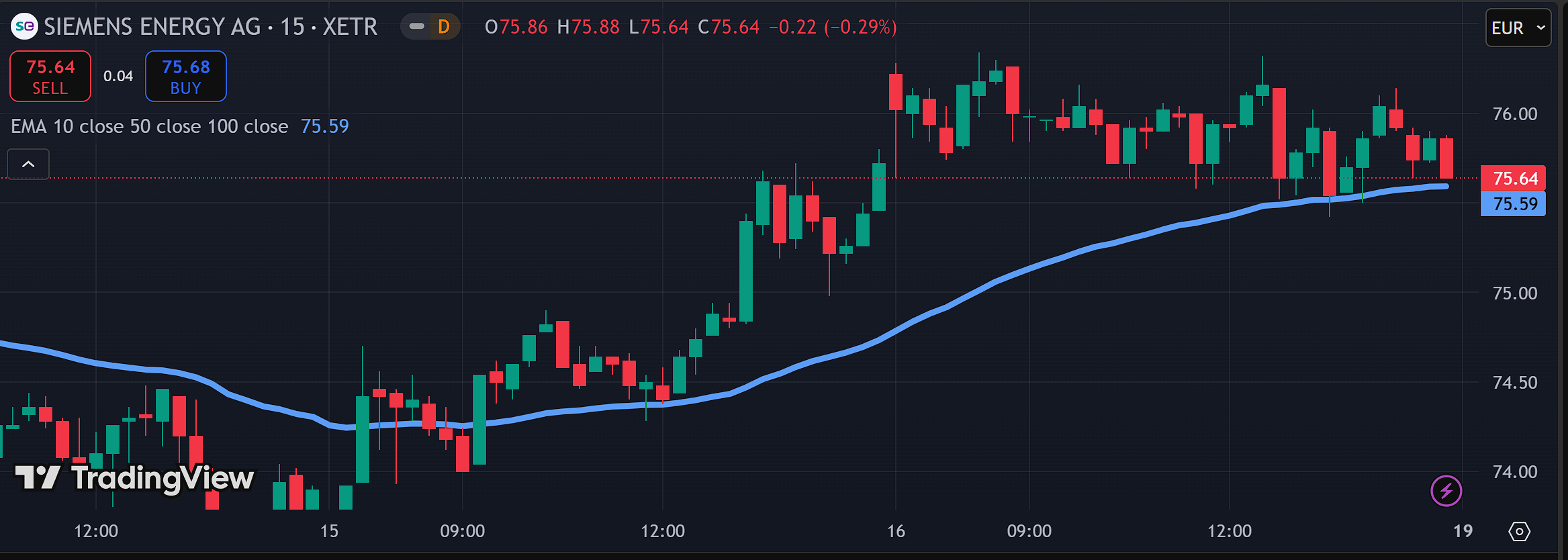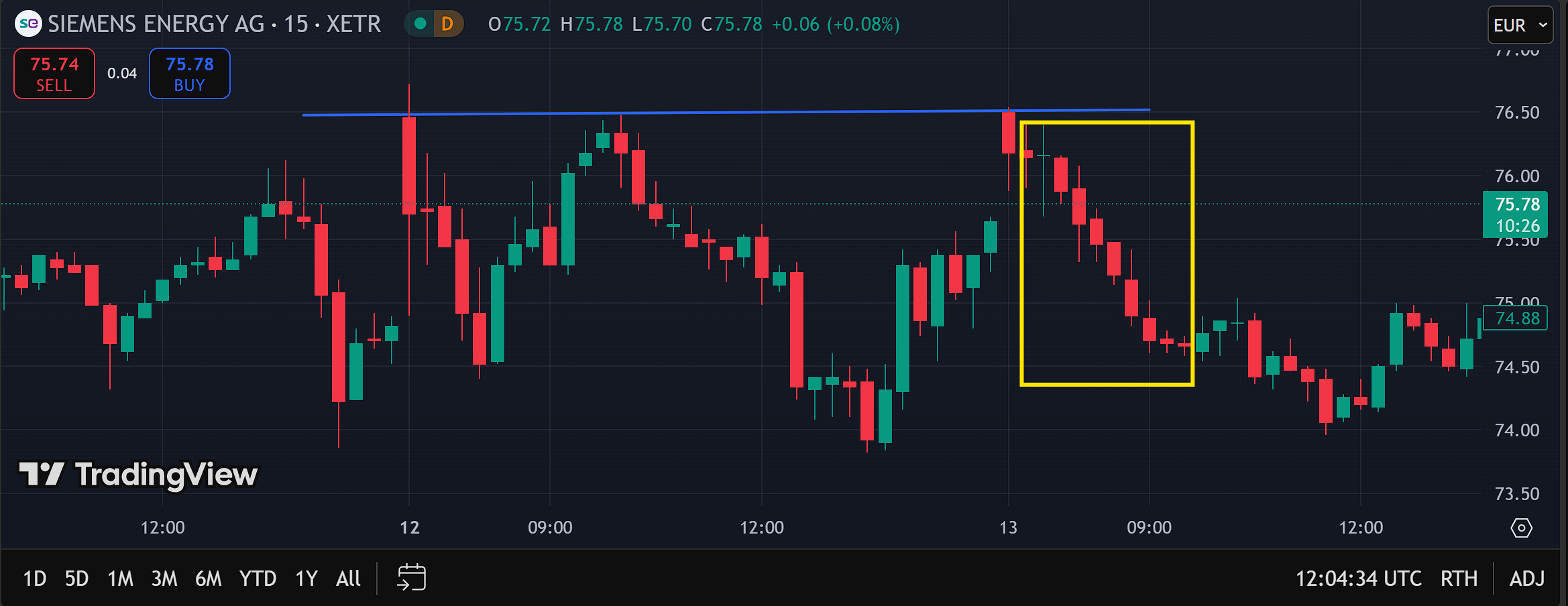 Shown above is the price chart of Siemens Energy AG (ENR), a provider of energy technology solutions. The chart has been set to 15-min trading intervals.