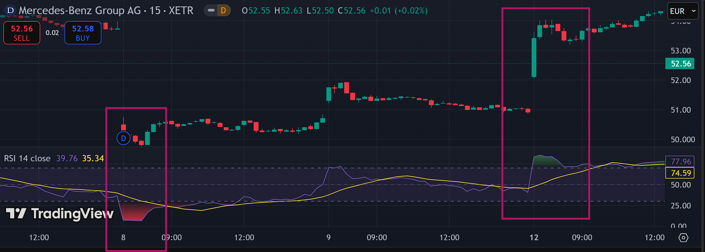 Shown above is the 15-min price chart of German luxury car maker Mercedes Benz Group AG. The RSI is displayed below the price chart; note both areas highlighted by the boxes in pink.