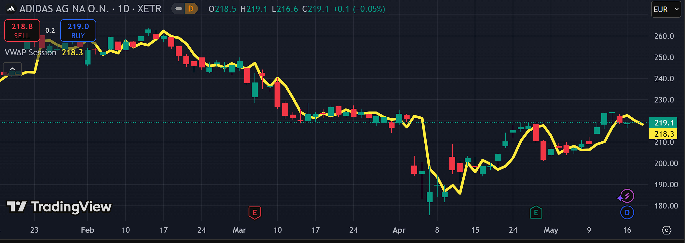 Shown above is the price chart of lifestyle retailer Adidas AG, at 15-min trading intervals. The VWAP has been added, seen here as the yellow line.
