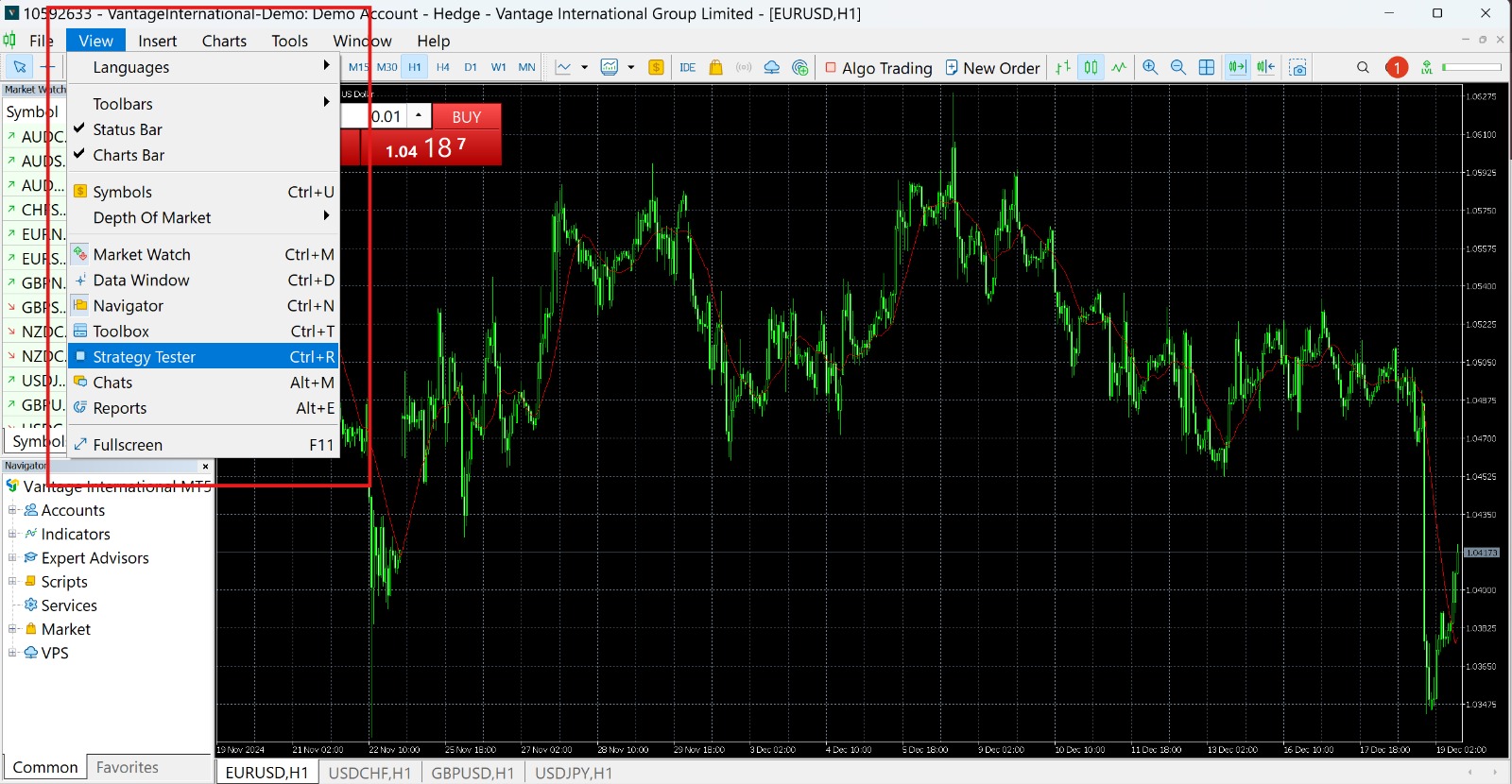 Once you’ve logged into MT 5, you can call out Strategy Tester via the top toolbar. Click View, then Strategy Tester. Alternatively, type Ctrl + R.