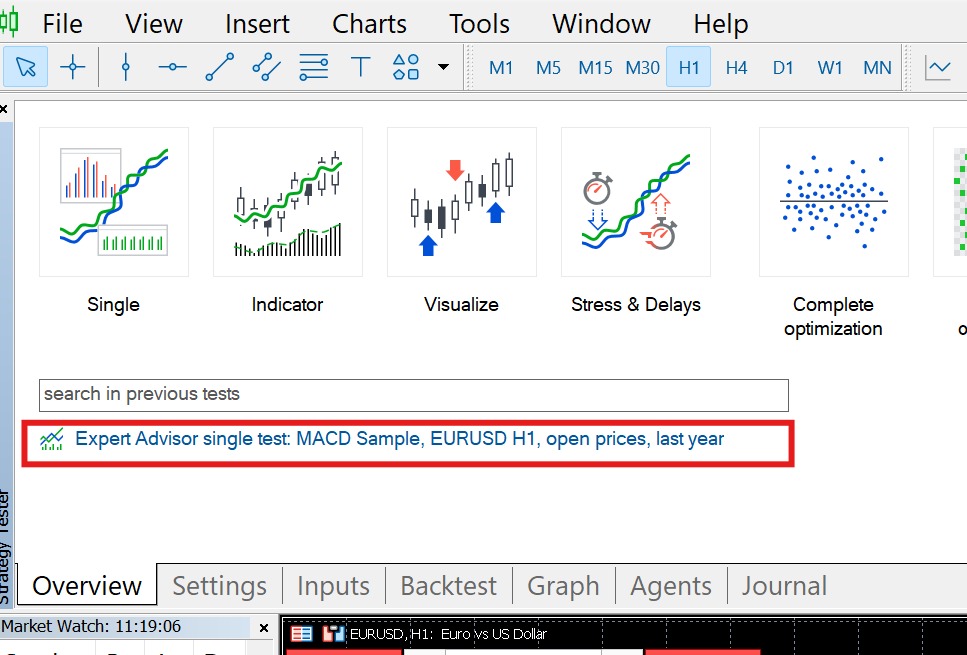 Traders can test their selected EAs using Strategy Tester, which operates based on historical quotes of currencies, stocks and other assets. EAs being tested follow their own algorithms to run through accumulated quotes and perform virtual transactions; this allows an evaluation of how the EA would have traded during the selected time period.