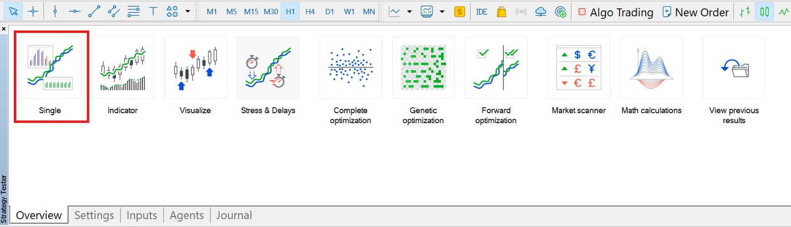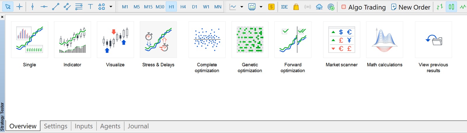 As you can see, there are multiple icons that help you operate Strategy Tester. Traders can perform different backtests by clicking on the relevant icon.