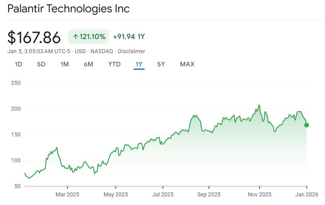 4. “Palantir Stock $150 in 2025 History.” Yahoo Finance, https://finance.yahoo.com/news/palantir-stock-150-2025-history-091500261.html. Accessed 5 January 2026.