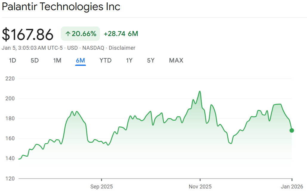 Source: Google Finance (https://www.google.com/finance/quote/PLTR:NASDAQ?sa=X&ved=2ahUKEwjJs9-Tjq6LAxXt2DgGHQMXDZcQ3ecFegQIQBAf&window=6M)