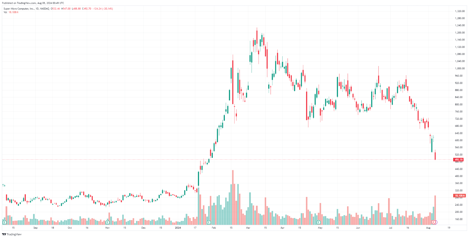 • Supermicro shares plummeted by 13% on Tuesday, 6 August 2024, following the release of their fiscal fourth-quarter earnings, which fell short of analysts’ predictions.