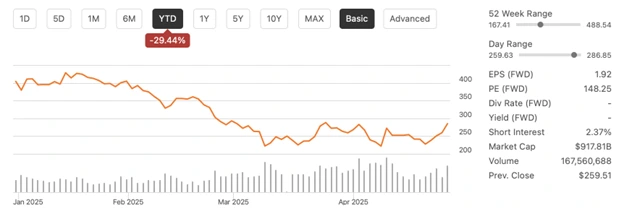 The chart hints at a possible recovery, with the stock breaking out of a US$227–$263 trading range on solid volume, but the rally feels shaky amid swirling uncertainties.