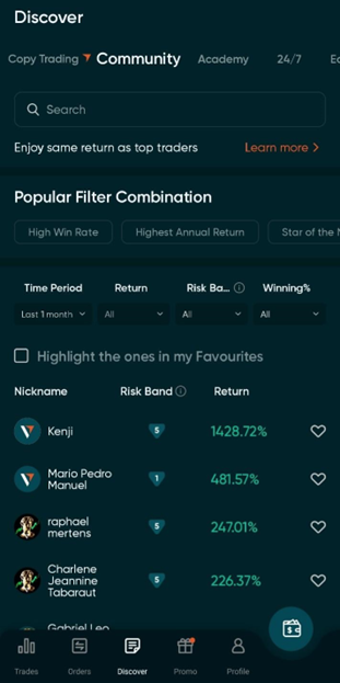 L’interfaccia utente (UI) dell’app Copy Trading di Vantage è stata migliorata e ridisegnata. Nella scheda Community sono stati aggiunti filtri più completi. Questo permetterà ai Copiatori di trovare facilmente Fornitori di Segnali adatti alle loro esigenze.