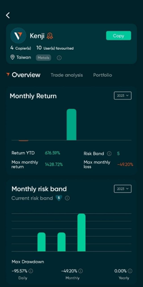 - Livello di rischio: È una misura della volatilità del trader. Un livello di rischio più alto indica che il trader assume rischi maggiori durante le operazioni. Questo è generalmente determinato da fattori come la strategia di trading del trader e gli asset negoziati.