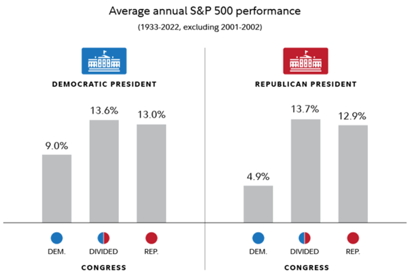 Storicamente, il mercato statunitense ottiene i migliori risultati con un Congresso diviso. Questo è vero sia con un presidente Democratico che Repubblicano.