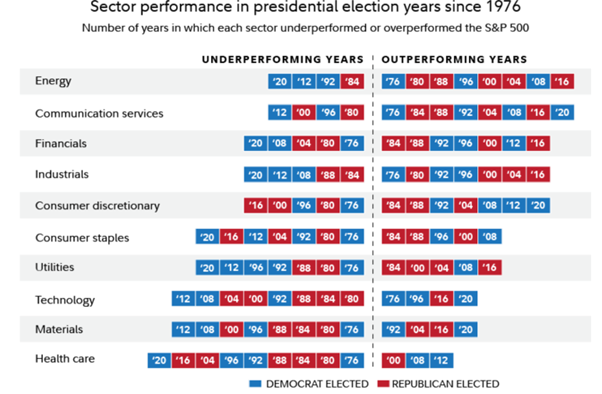 Basato su dati che risalgono al 1976, diversi settori hanno avuto la loro parte di prestazioni inferiori o superiori rispetto all’S&P 500. Questo è stato indipendente dal fatto che il Presidente fosse un Democratico o un Repubblicano.