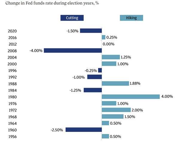 Ecco un grafico che dettaglia tutte le modifiche ai tassi implementate dalla Fed statunitense durante gli anni elettorali: