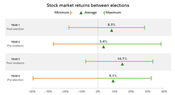 Secondo i dati di Fidelity, dal 1950, l’S&P 500 ha registrato un rendimento medio del 9,1% durante gli anni elettorali. Dato che le azioni statunitensi sono storicamente aumentate nel lungo termine, questo dato non è fuori dall’ordinario.