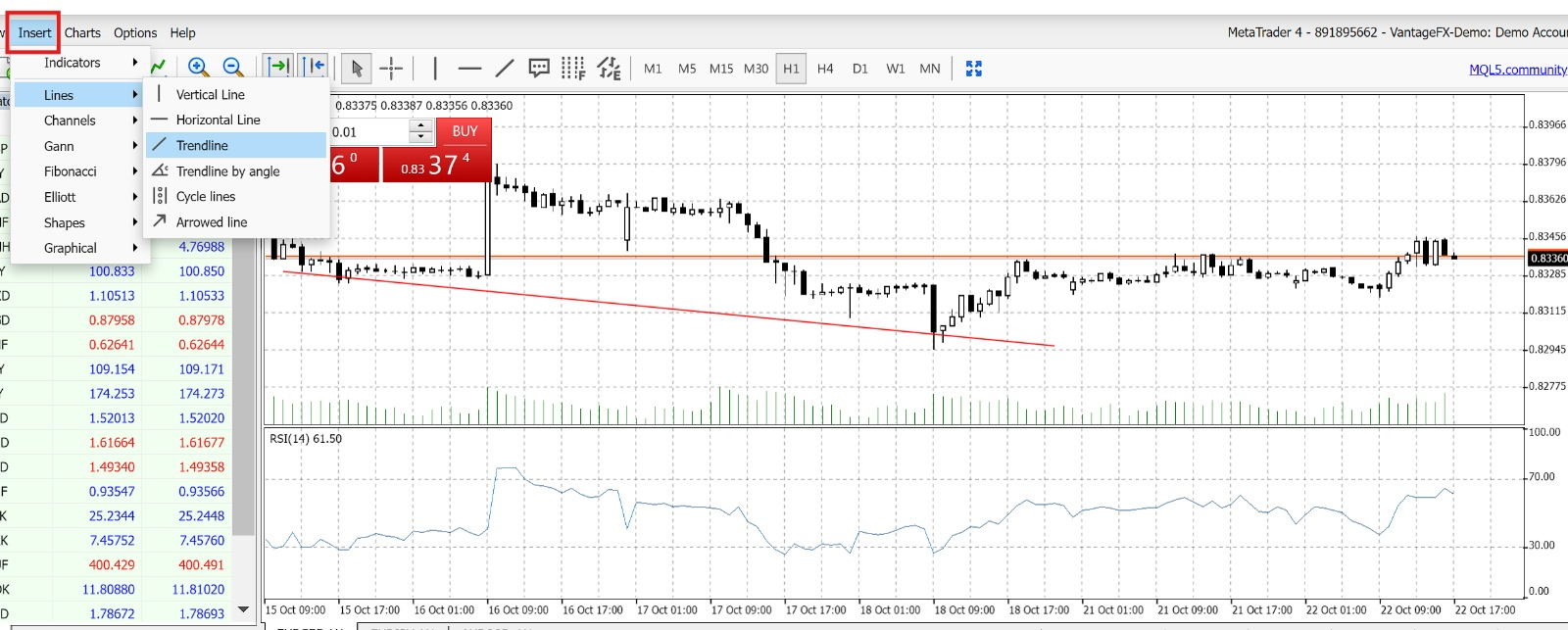 Puoi fare lo stesso con gli oggetti di grafici. Nello screenshot sopra, abbiamo aggiunto una linea di tendenza (la linea rossa inclinata verso il basso). Questo è stato fatto selezionando “Inserisci” nella barra degli strumenti in alto, poi “Linee” e infine “Linee di tendenza”.