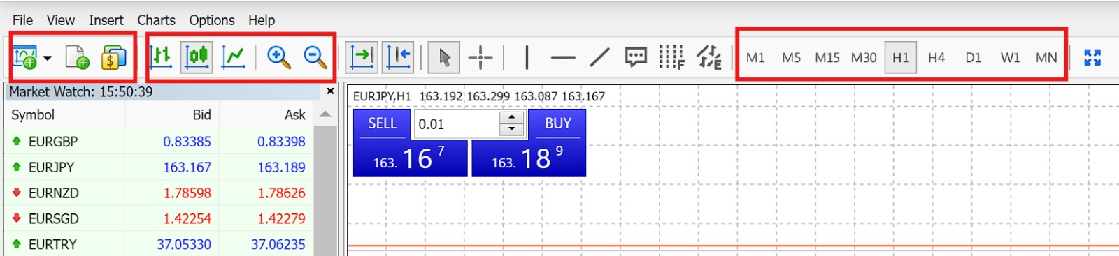 Nel primo gruppo di simboli (il quadrato più a sinistra), puoi creare un nuovo grafico, avviare un nuovo ordine o scegliere altri mercati oltre al forex. (MT4, sebbene sia fortemente orientato al forex, supporta anche il trading di azioni, materie prime, obbligazioni e altri asset.) Approfondiremo ogni pulsante in dettaglio più avanti.