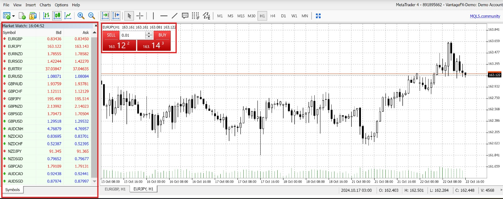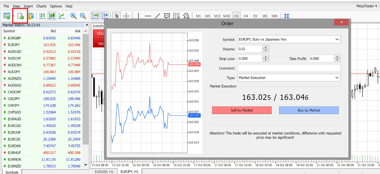 Il quadrato rosso più piccolo accanto a Market Watch evidenzia il sottomenu di trading, che mostra in tempo reale il prezzo della coppia di valute. Puoi eseguire un’operazione utilizzando questo sottomenu, inserendo la dimensione del lotto di trading e cliccando sul pulsante Compra o Vendi, a seconda delle esigenze.