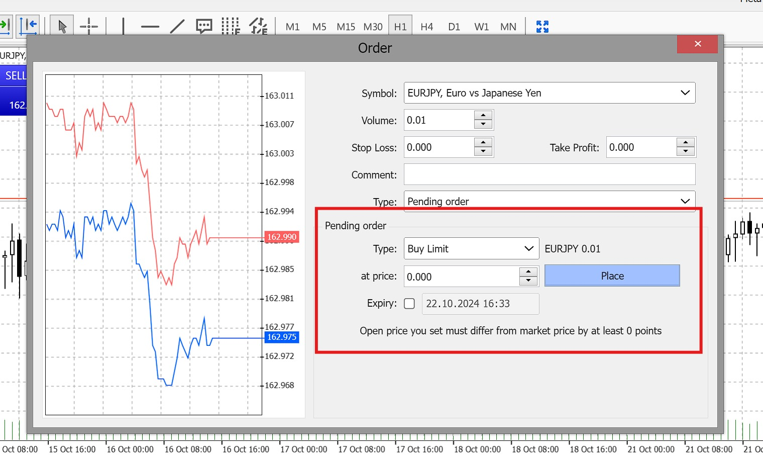 Qui puoi inserire il volume della tua operazione e impostare i livelli di stop-loss e take-profit. Puoi anche scegliere tra Ordine a Mercato (che esegue l’ordine immediatamente al prezzo di mercato attuale) o Ordine Pendenti (per aspettare un punto di ingresso desiderato).