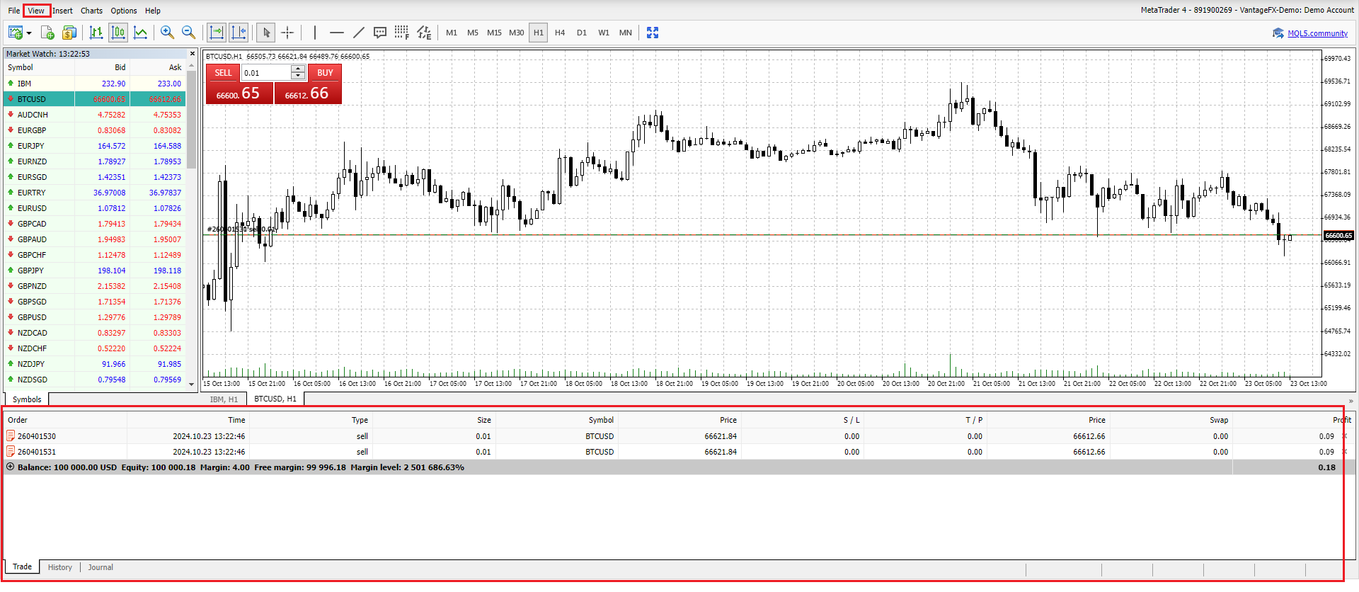 Gli ordini inseriti ma non ancora eseguiti possono essere modificati o gestiti. Per farlo, clicca su “Visualizza” nella barra degli strumenti in alto, quindi su “Casella degli strumenti”. Questo aprirà il pannello della Casella degli strumenti nella parte inferiore dello schermo.