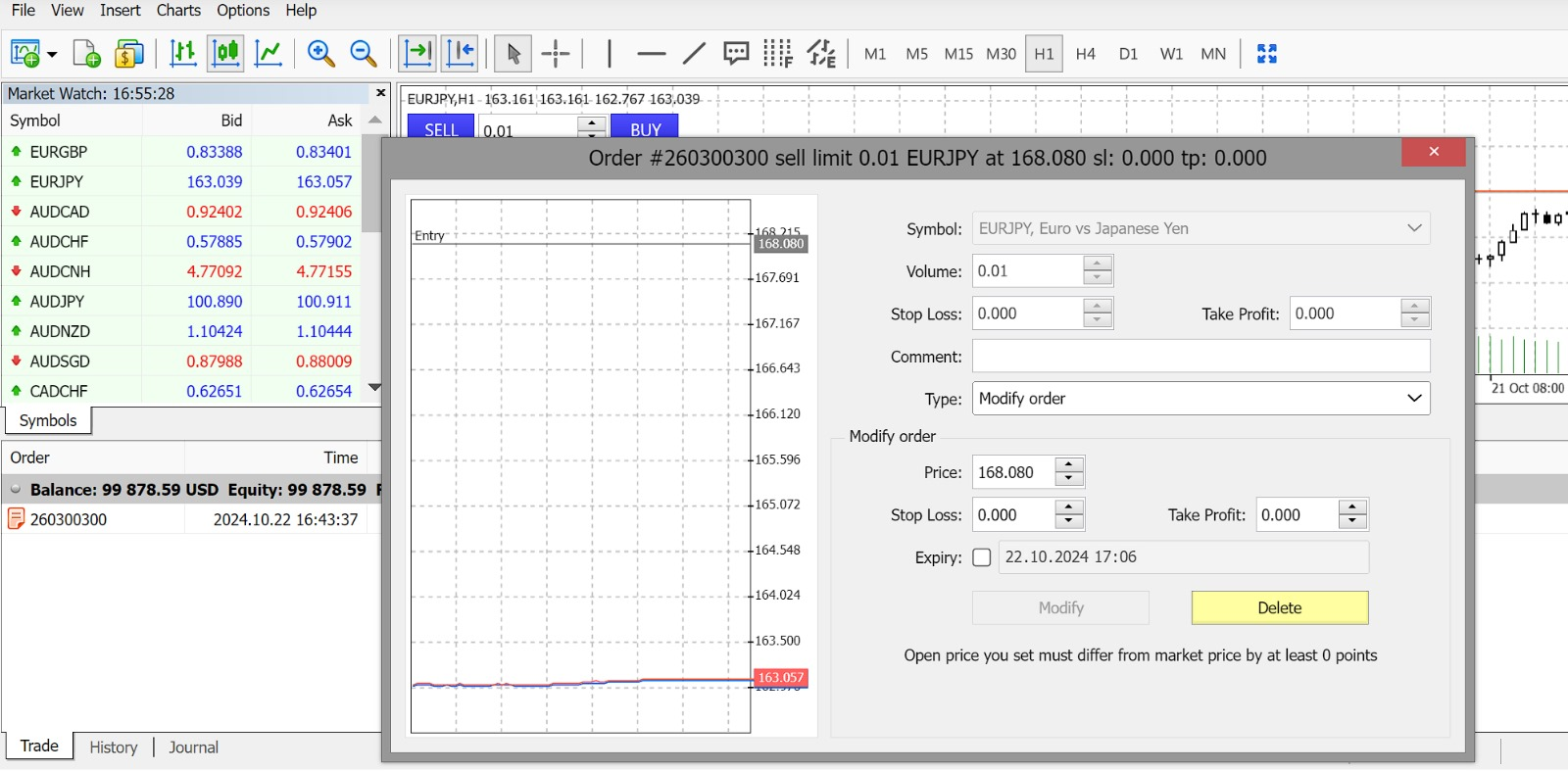 Nella scheda “Trade”, saranno elencati i tuoi ordini pendenti. Puoi fare clic con il pulsante destro sull’ordine che desideri modificare e selezionare “Modifica o Elimina”.