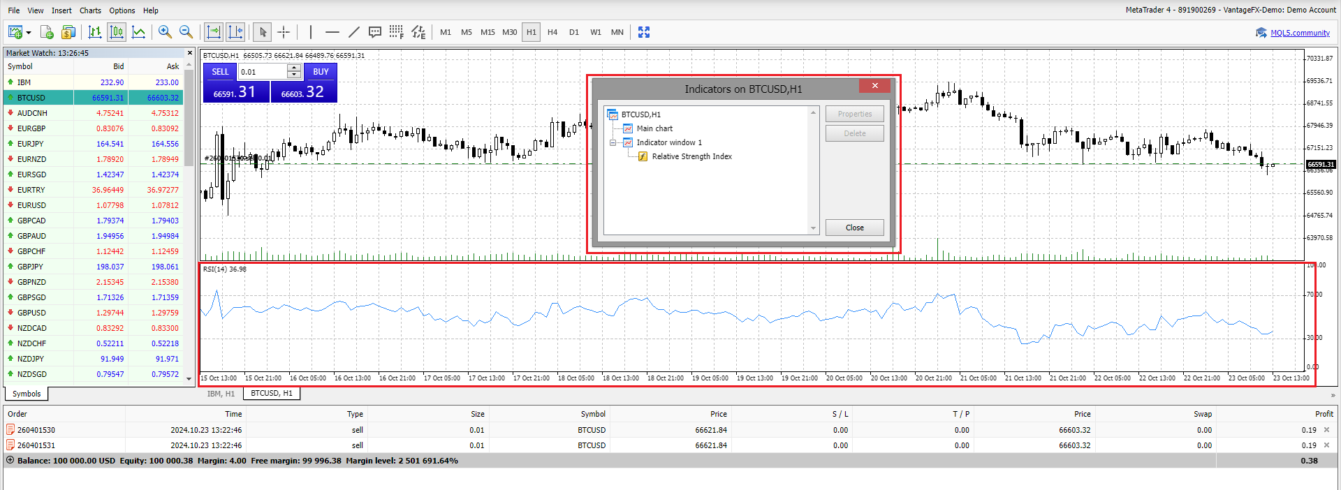 Qui abbiamo aggiunto l’Indice di Forza Relativa (RSI), che appare come un pannello separato nella parte inferiore dello schermo.