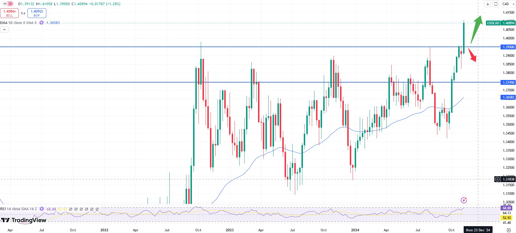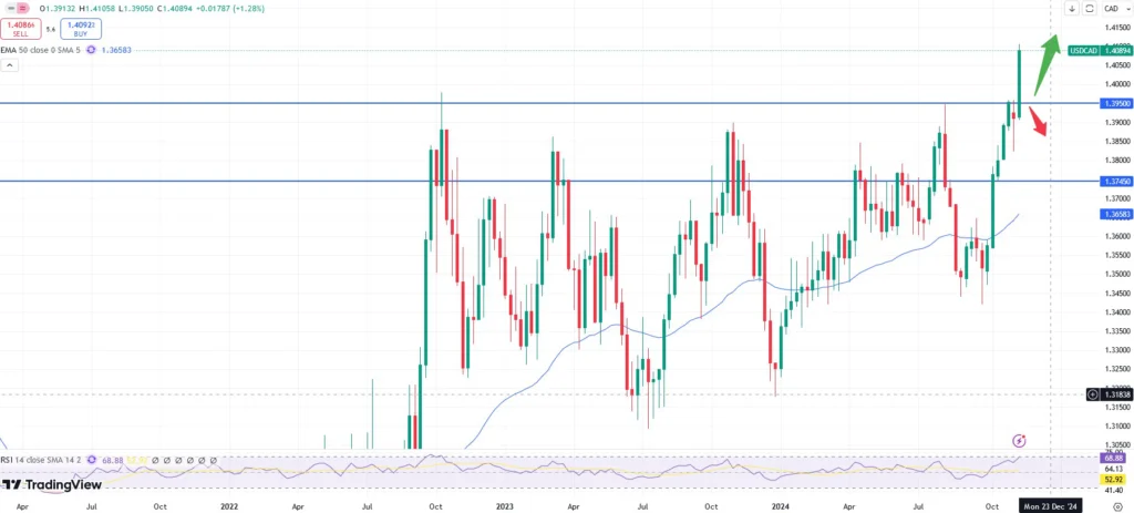 La coppia USDCAD ha sfondato il livello di resistenza di 1,3950, innescando uno slancio al rialzo che potrebbe estendersi verso la zona di 1,4200. Un potenziale ritracciamento verso l’area di breakout potrebbe presentare nuove opportunità di acquisto.