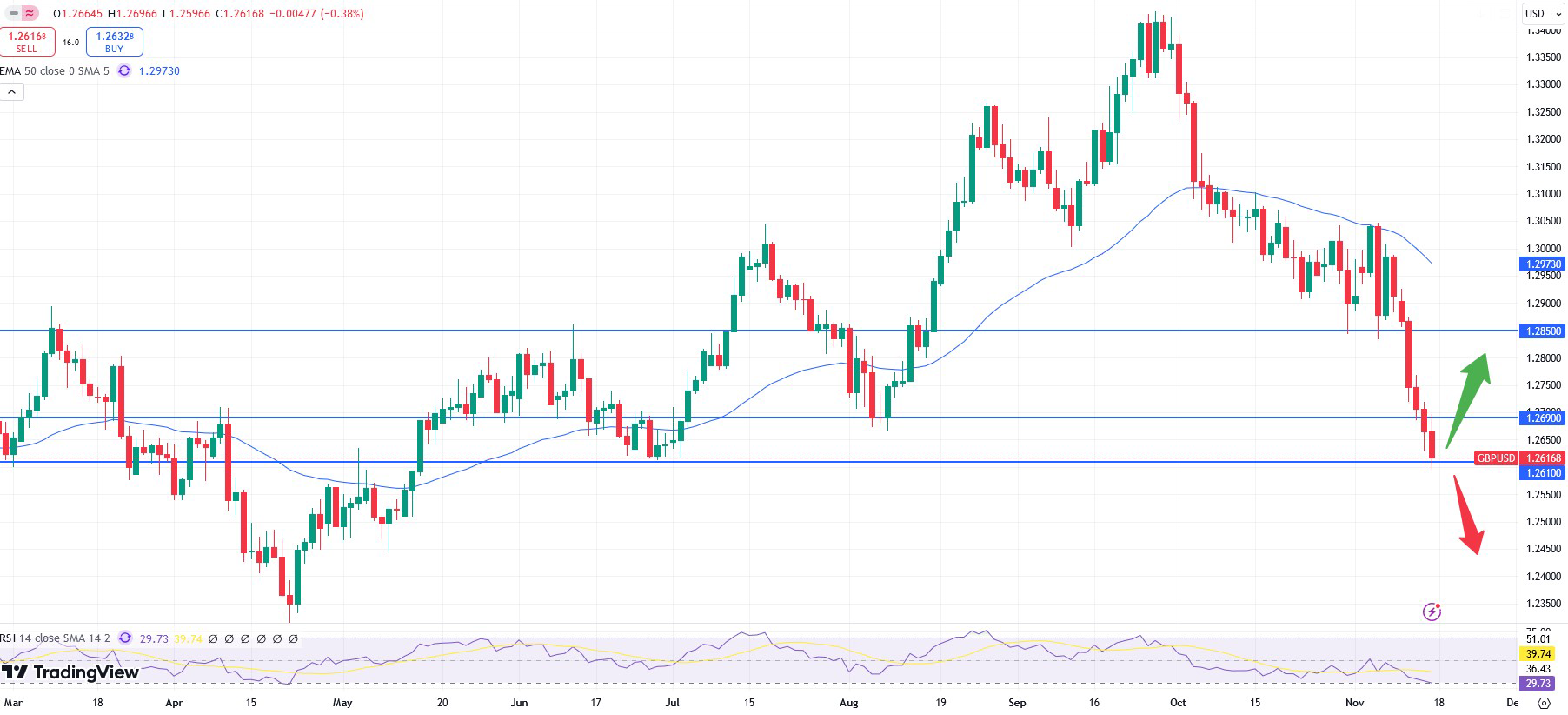 In generale, l’attuale tendenza della sterlina britannica (GBP) è negativa rispetto alla maggior parte delle altre valute. Rispetto al dollaro statunitense (USD), la sterlina si trova attualmente al di sopra di una leggera zona di supporto. Se quest’area resiste, il mercato potrebbe salire, come indicato dalle frecce in alto. Tuttavia, una rottura al di sotto del livello di 1,2615 potrebbe innescare un cambiamento nel sentimento, con un probabile slancio ribassista a prendere il controllo.