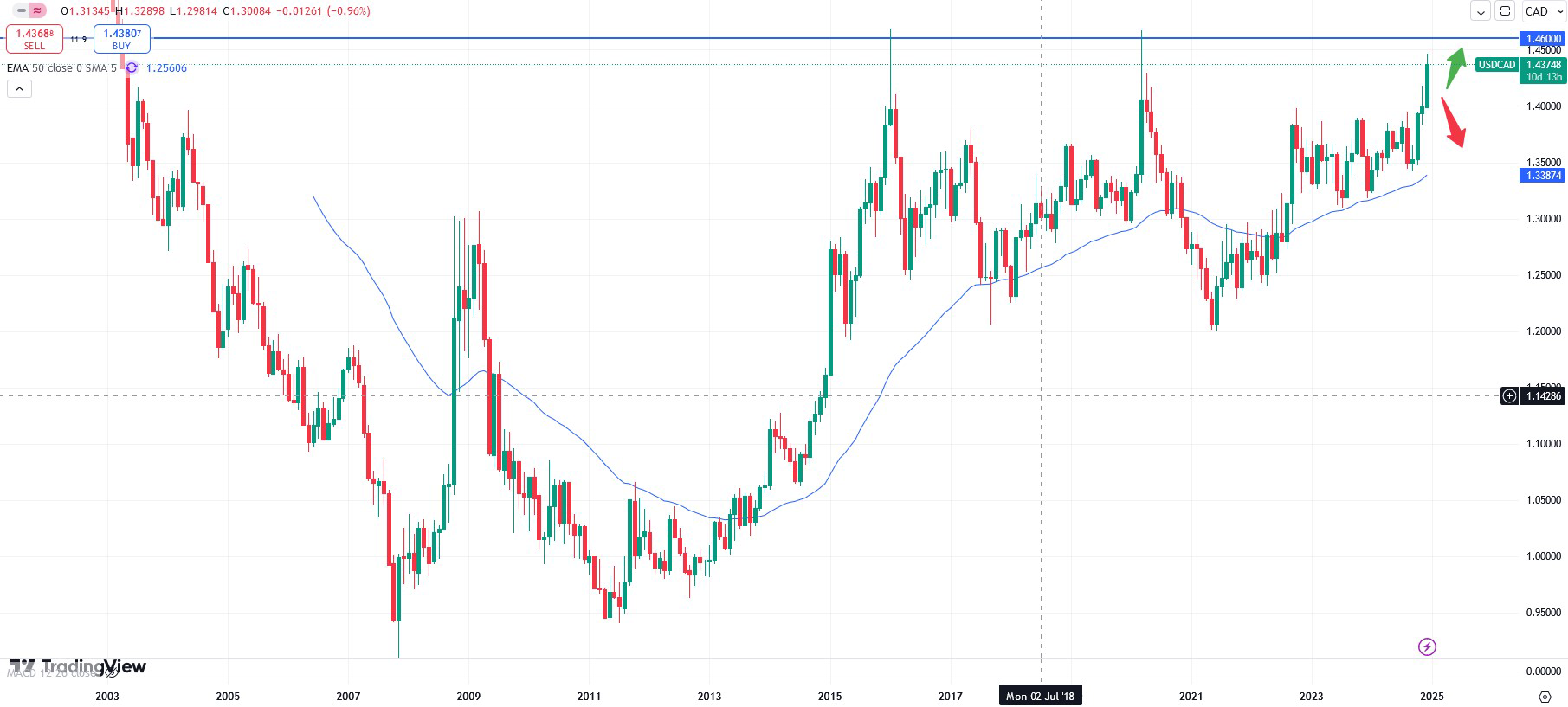 Come mostra il grafico mensile in alto, la coppia di valute si è mossa verso l’area di 1,4600, che segna una forte zona di resistenza. Se il mercato dovesse iniziare una correzione a quel livello, potrebbe formarsi un triplo top che indica una spinta verso livelli più bassi. Inoltre, la spinta verso l’alto durante la maggior parte del 2024 potrebbe terminare con la chiusura delle posizioni da parte degli operatori verso la fine dell’anno. Ciò potrebbe causare un ritracciamento verso il basso. Il prodotto interno lordo del Canada sarà pubblicato il23 dicembre 2024, alle 14:30 CET.