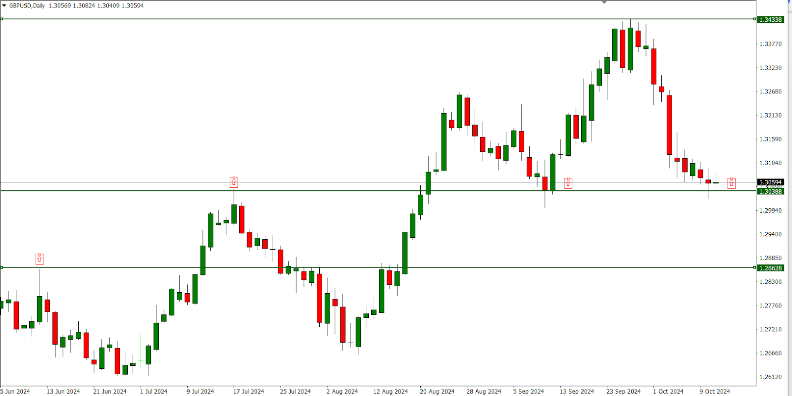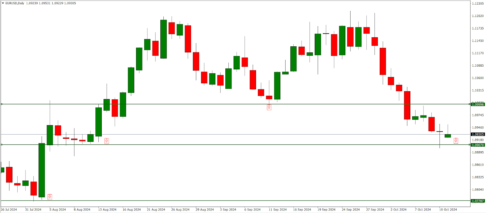 Il grafico giornaliero di EURUSD indica un potenziale rifiuto del supporto a 1,0900. Se questo rifiuto regge, il tasso di cambio potrebbe salire a 1,0990. Al contrario, se il rifiuto fallisce, la coppia potrebbe scendere verso 1,0770.
