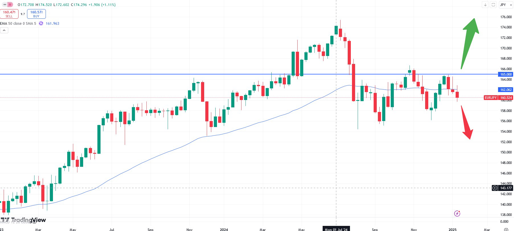 Il grafico settimanale della coppia di valute EURJPY potrebbe offrire un nuovo ribasso. Essendo scesi nuovamente al di sotto della media mobile a 50, i prezzi potrebbero continuare a diminuire a favore dello yen. Il mercato ha iniziato a scambiare di nuovo al di sotto della media mobile a 50, trovando una chiara resistenza. Solo una rottura della zona di resistenza di 165,00 potrebbe offrire un breakout rialzista. Le questioni fondamentali non dovrebbero essere ignorate dal Giappone, ma potrebbe verificarsi un iniziale slancio verso il basso. I dati PMI si terranno venerdì 24 gennaio alle 09:30 CET.