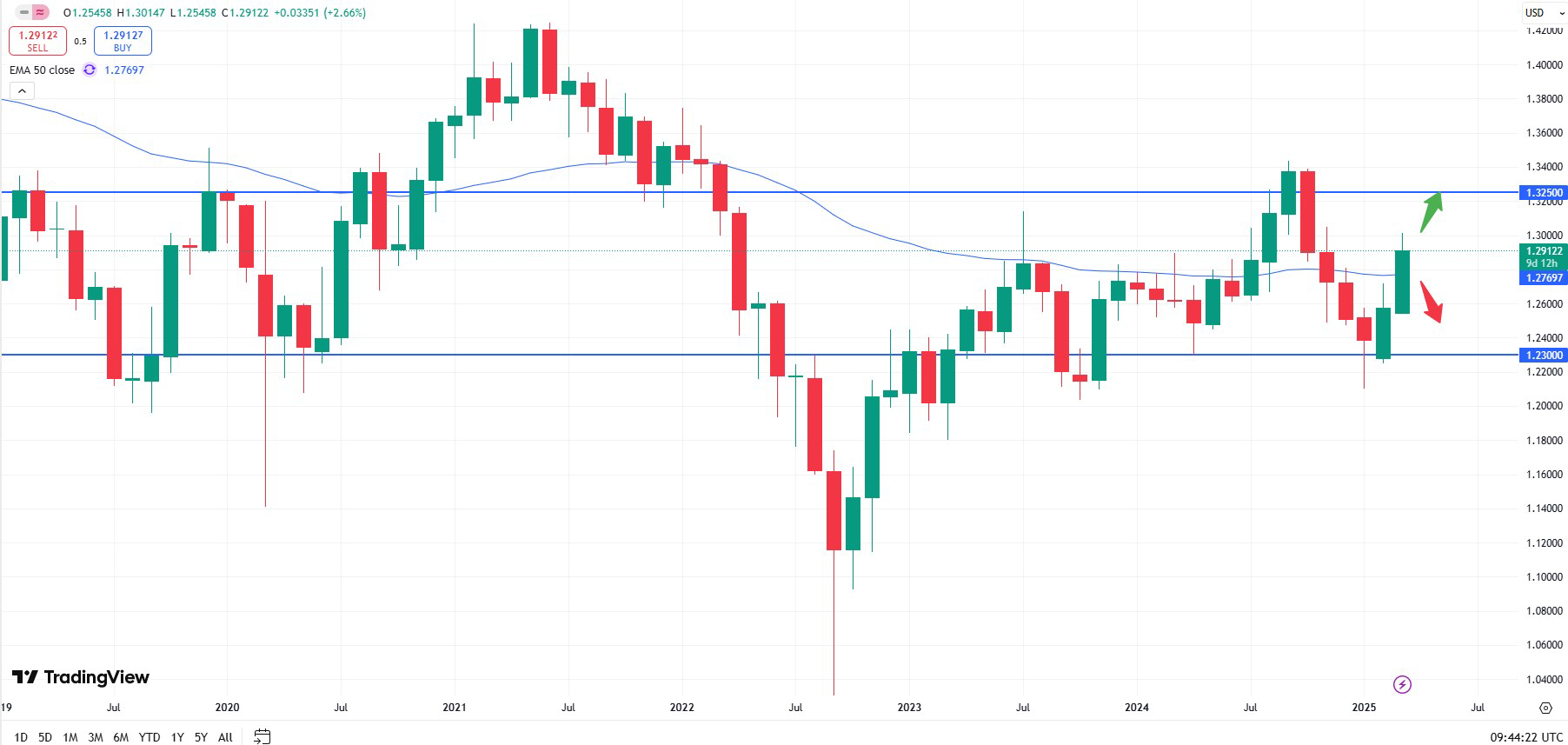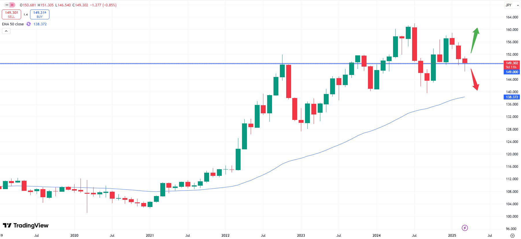 Il grafico mensile della coppia di valute USDJPY mostra che il mercato potrebbe essere pronto per un rimbalzo verso l’alto. Se il prezzo dovesse continuare a scambiare al di sopra del livello di 149,00, ci si potrebbe aspettare un aumento dei prezzi. L’aumento dei prezzi al consumo potrebbe inoltre favorire questa visione, in quanto si prevede che la Fed rimanga sul suo attuale percorso di tassi più a lungo. L’indice degli Stati Uniti sarà pubblicato il 28 marzo 2025 alle 13:30 CET.