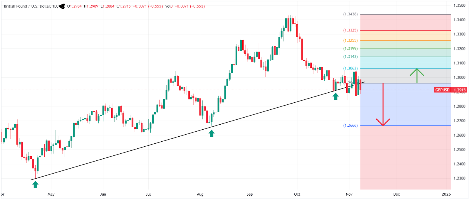La scorsa settimana, la coppia GBPUSD ha rotto al di sotto della sua linea di tendenza rialzista sul grafico giornaliero a 1,2960, sotto la spinta dei tagli dei tassi della BoE e della Fed e della vittoria elettorale di Trump. Se il breakout al ribasso regge la prossima settimana, la coppia potrebbe puntare a 1,2670, mentre un breakout fallito potrebbe vedere un rally verso 1,3060, influenzato dai prossimi rilasci dell’IPC statunitense e del PIL britannico.