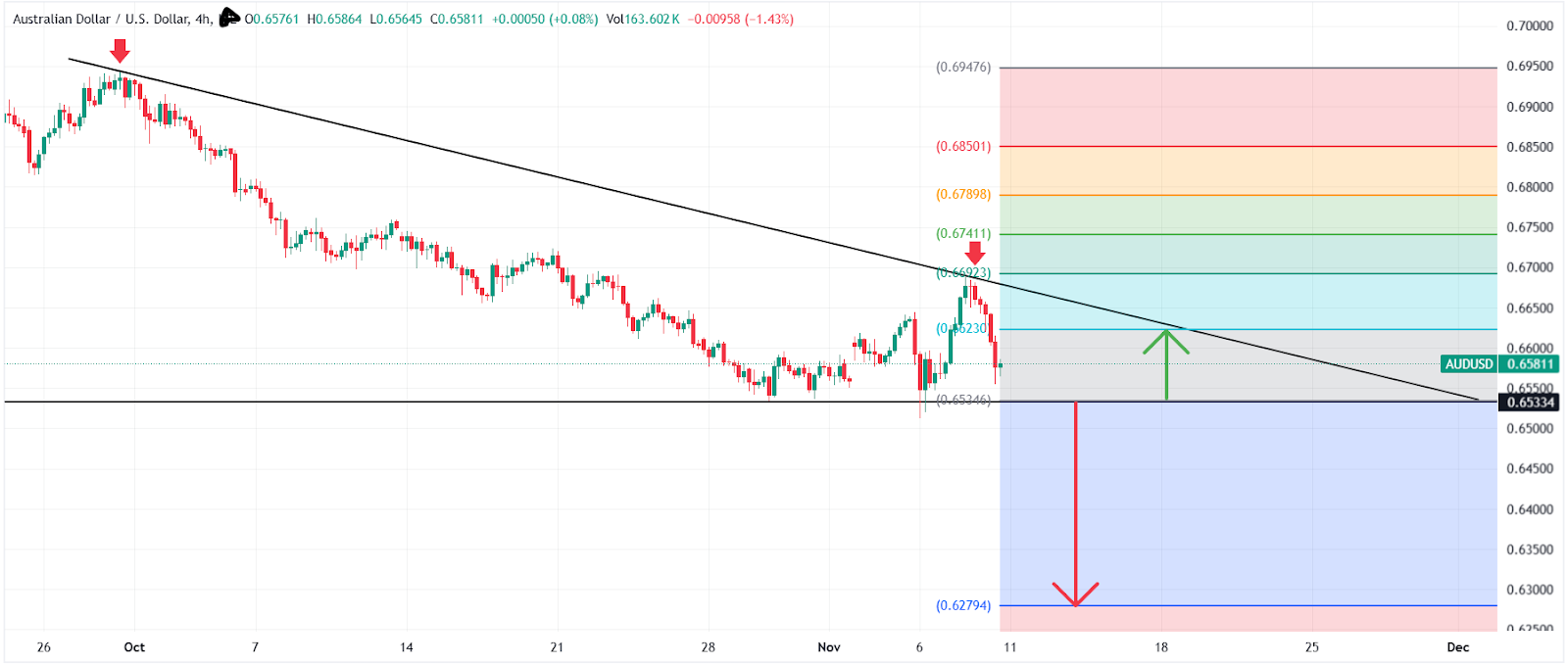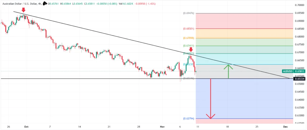 La scorsa settimana, AUDUSD è stato respinto dalla linea di tendenza al ribasso a 4 ore vicino a 0,6690, scivolando fino a circa 0,6580. Anche il taglio dei tassi negli Stati Uniti non ha danneggiato il dollaro e anzi lo ha fatto salire ulteriormente. Una rottura al di sotto del supporto di 0,6540 potrebbe aprire la strada verso 0,6280. Tuttavia, se il breakout fallisce, è probabile un rimbalzo verso 0,6620. Le prossime mosse dipendono dall’imminente pubblicazione del tasso di disoccupazione dell’AUD e dell’IPC statunitense.
