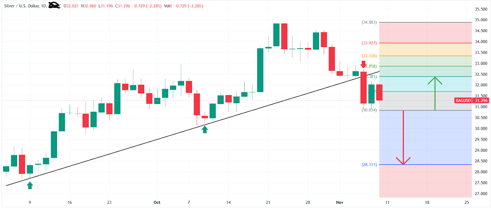 La scorsa settimana, XAGUSD ha rotto la linea di tendenza rialzista del grafico giornaliero a 32,40 USD e attualmente è scambiato intorno a 31,30 USD. Se il breakout regge, è probabile un movimento verso 28,30 USD.