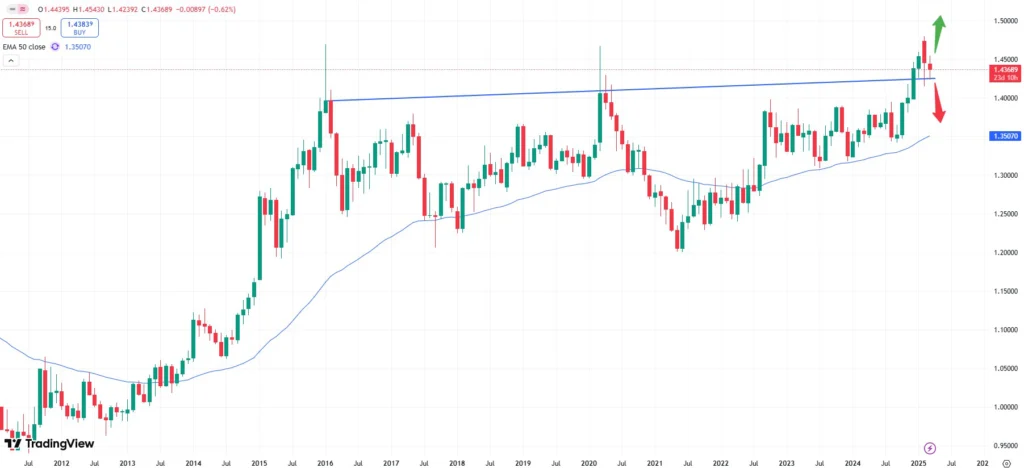 Poiché di recente il prezzo ha superato la zona di resistenza di 1,4300, potrebbe verificarsi un ulteriore slancio verso l’alto. Un ingresso potenzialmente più sicuro per l’acquisto potrebbe essere al di sopra dei recenti massimi di 1,4600. Il potenziale di rialzo potrebbe continuare da lì. Un taglio dei tassi potrebbe aiutare ulteriormente la coppia di valute, in quanto il CAD potrebbe perdere vigore. La decisione verrà presa mercoledì 12 marzo alle 14:45 CET.