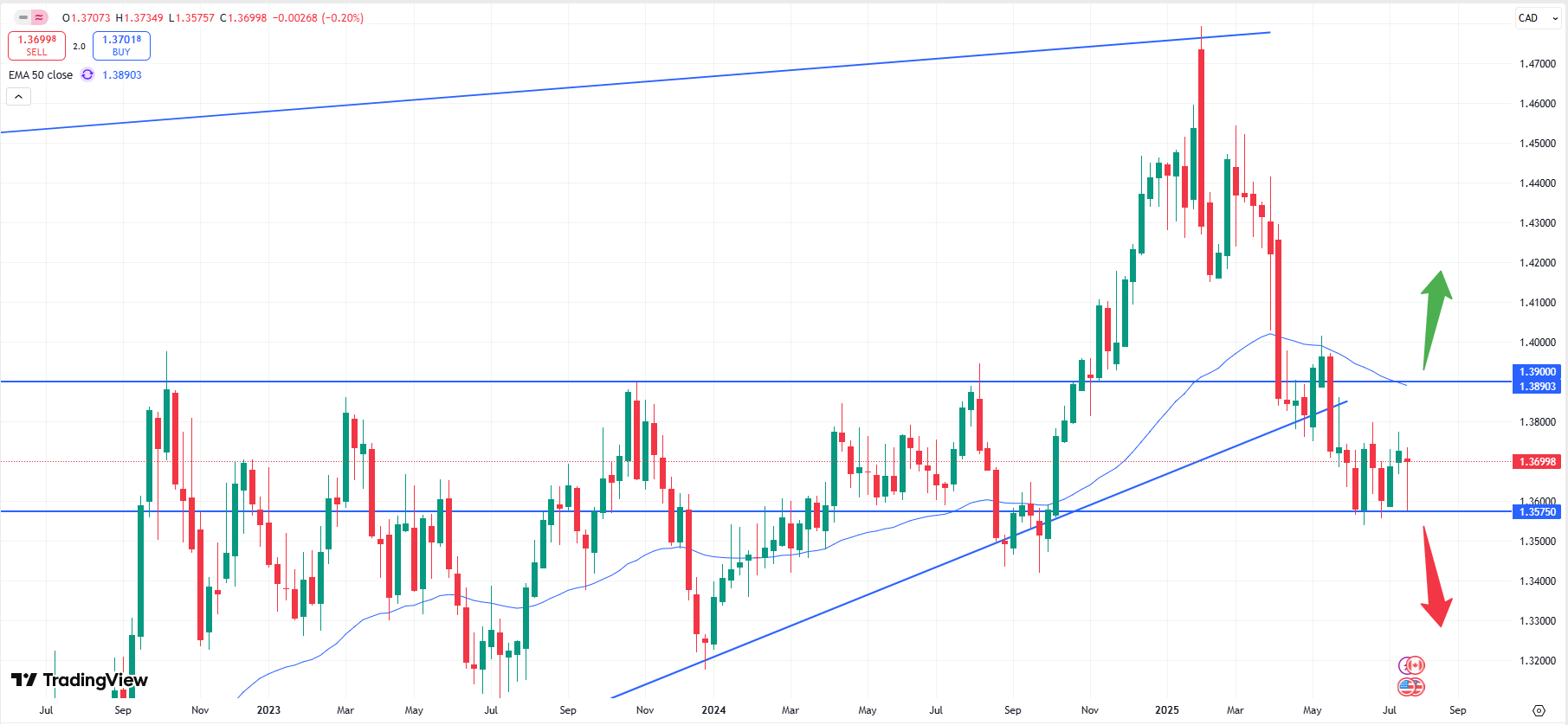 Osservando il grafico settimanale sopra riportato, il prezzo della coppia di valute USDCAD è sceso al di sotto del recente trend al rialzo. Una rottura della zona 1,3575 potrebbe causare un ulteriore calo del mercato a favore del dollaro canadese, mentre una spinta al rialzo potrebbe riaccendere il momentum rialzista. Vale la pena ricordare che anche la media mobile a 50 si trova nella zona di resistenza tecnica a 1,3900. Solo un taglio dei tassi potrebbe far proseguire il trend rialzista, mentre sono prevedibili prezzi più bassi. I dati saranno pubblicati mercoledì 30 luglio alle 15:45 CET.