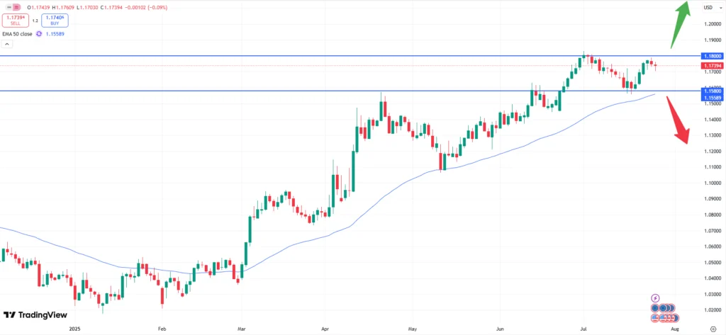 Sebbene il trend della coppia di valute rimanga fortemente rialzista, potrebbero verificarsi anche dei ritracciamenti. Una rottura della zona di resistenza tecnica causerebbe la continuazione del trend. D’altra parte, una rottura della zona di supporto vicino alla media mobile a 50 a 1,1580 potrebbe causare un ribasso del mercato. Le dichiarazioni di Jerome Powell durante la conferenza stampa rimarranno fondamentali. I dati saranno pubblicati mercoledì 30 luglio alle 20:00 CET.