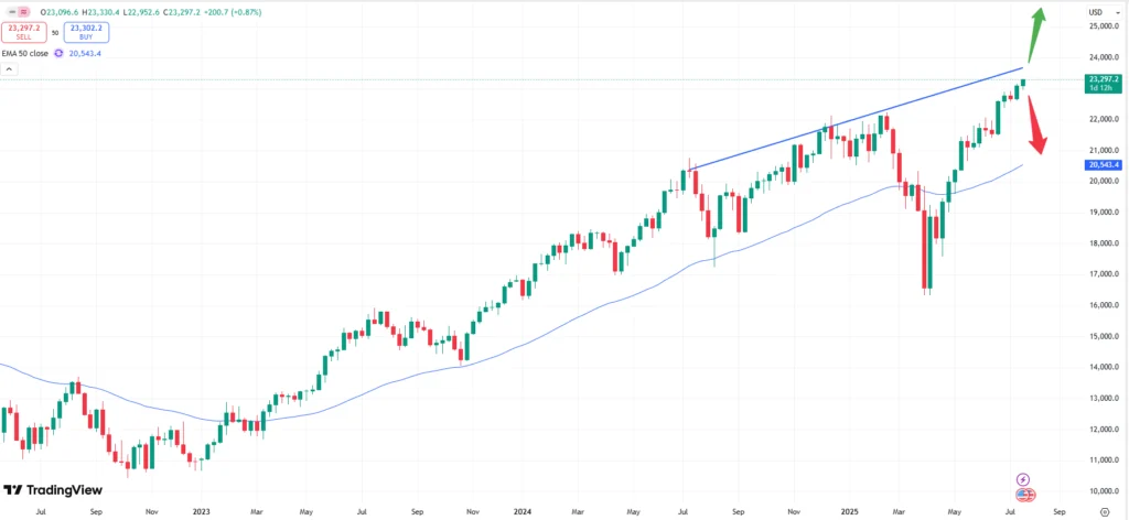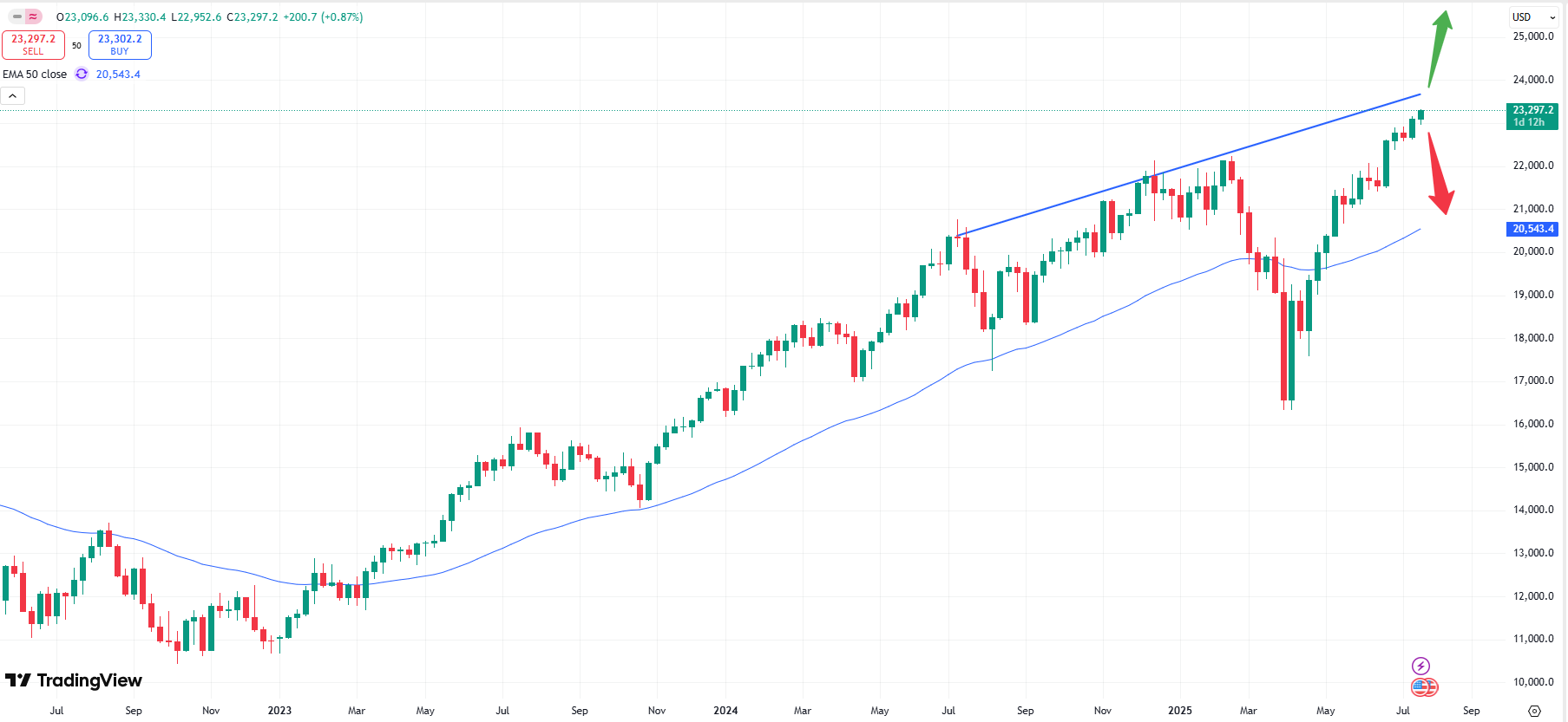 Un’analisi più approfondita dell’indice Nasdaq rivela che il mercato potrebbe ancora salire verso la linea di resistenza tecnica. Solo allora potrebbe verificarsi un momentum negativo. Un dato più debole potrebbe innescare un’altra fase di rialzo dei prezzi, poiché la FED dovrebbe agire piuttosto rapidamente. I dati saranno pubblicati venerdì 1 agosto alle 14:30 CET.
