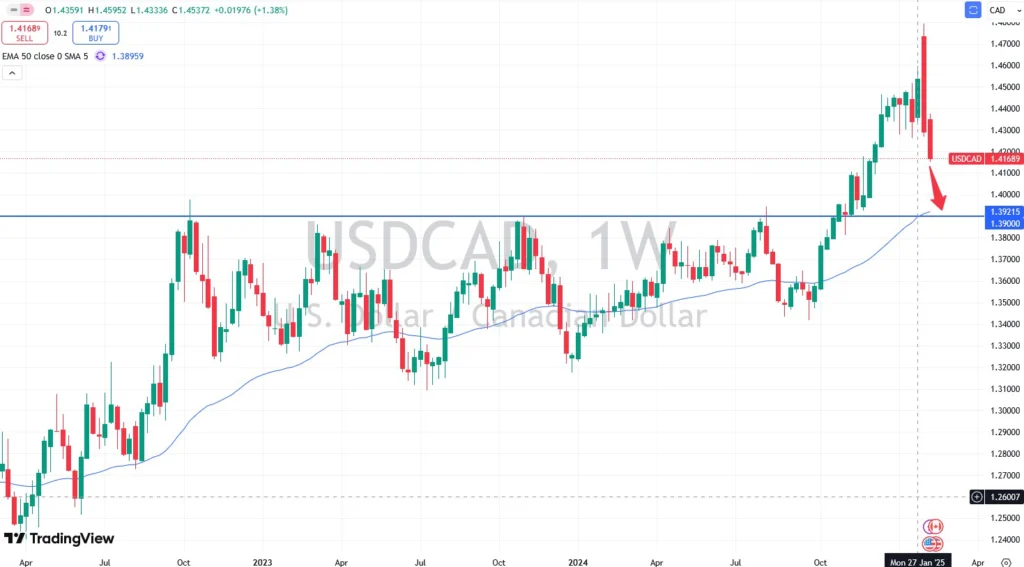 Il grafico settimanale dell’USDCAD mostra che si è verificato un forte ritracciamento, che potrebbe estendersi verso l’importante zona di supporto a 1,3900. In questa zona, inoltre, la media mobile crescente a 50 agirà come zona di supporto in entrata, causando potenzialmente un rimbalzo verso l’alto. I dati saranno pubblicati martedì 18 febbraio alle 14:30 CET.