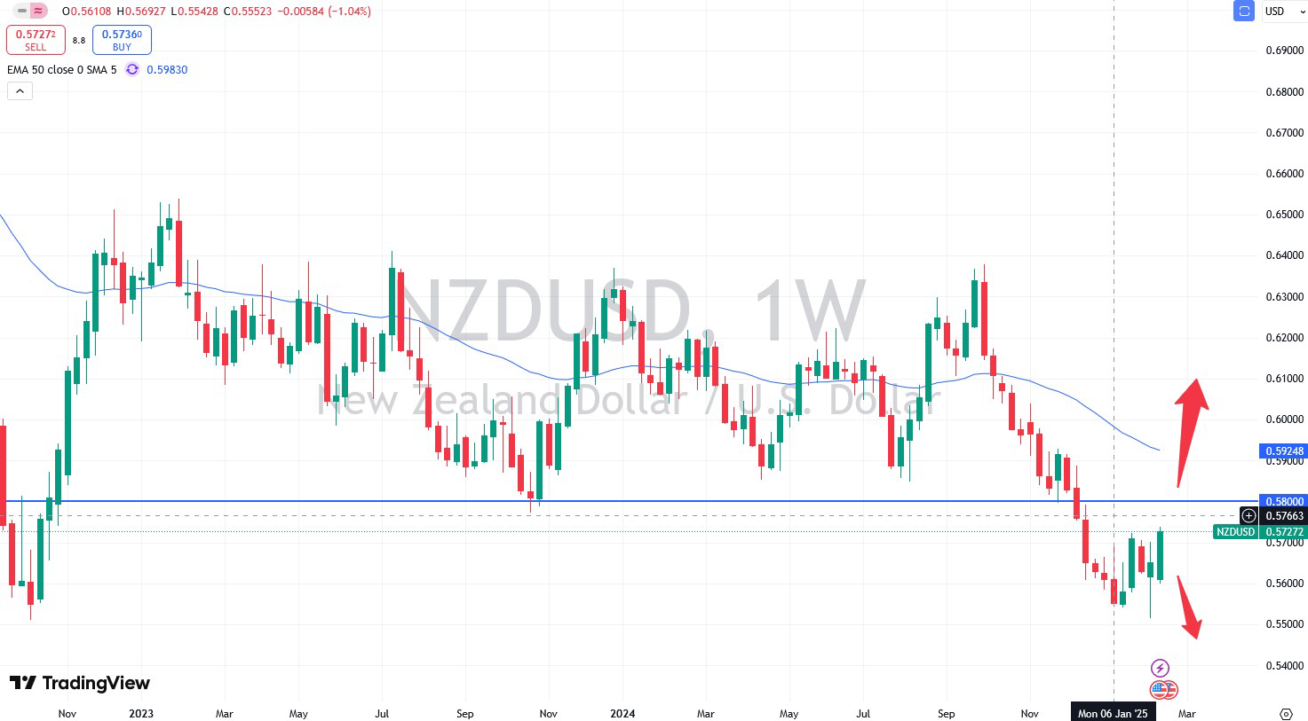 Inoltre, il pattern candlestick si allinea al momentum positivo. Un taglio dei tassi potrebbe ora causare un indebolimento del NZD. Se la zona di supporto a 0,5600 non verrà rotta, questo potrebbe rappresentare un nuovo potenziale di ingresso verso livelli più alti. L’obiettivo iniziale potrebbe essere la zona di resistenza a 0,5800. La decisione sui tassi di interesse si terrà mercoledì 19 febbraio alle 02:00 CET.