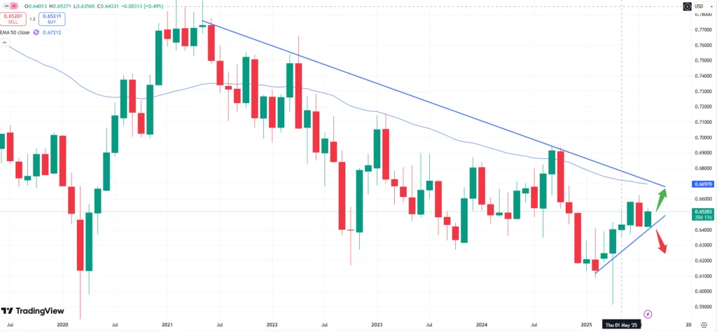 Attualmente il tasso della coppia continua a salire con potenziali possibilità di un ulteriore momentum al rialzo, come mostra il grafico mensile sopra riportato. C’è ancora spazio verso la linea di tendenza al ribasso, che è coerente con la media mobile a 50 giorni, anch’essa intorno a 0,6700. Il forte rifiuto al ribasso da aprile potrebbe aprire la strada a livelli più elevati. Sebbene il potenziale taglio dei tassi potrebbe causare un iniziale indebolimento dell’AUD, potrebbe verificarsi un nuovo slancio al rialzo, poiché i trader potranno entrare nel mercato a prezzi più bassi. Al di sopra del livello di 0,6590, il ritmo potrebbe intensificarsi se la recente zona di resistenza venisse superata. La decisione sui tassi sarà presa martedì 12 agosto alle 06:30 CET.