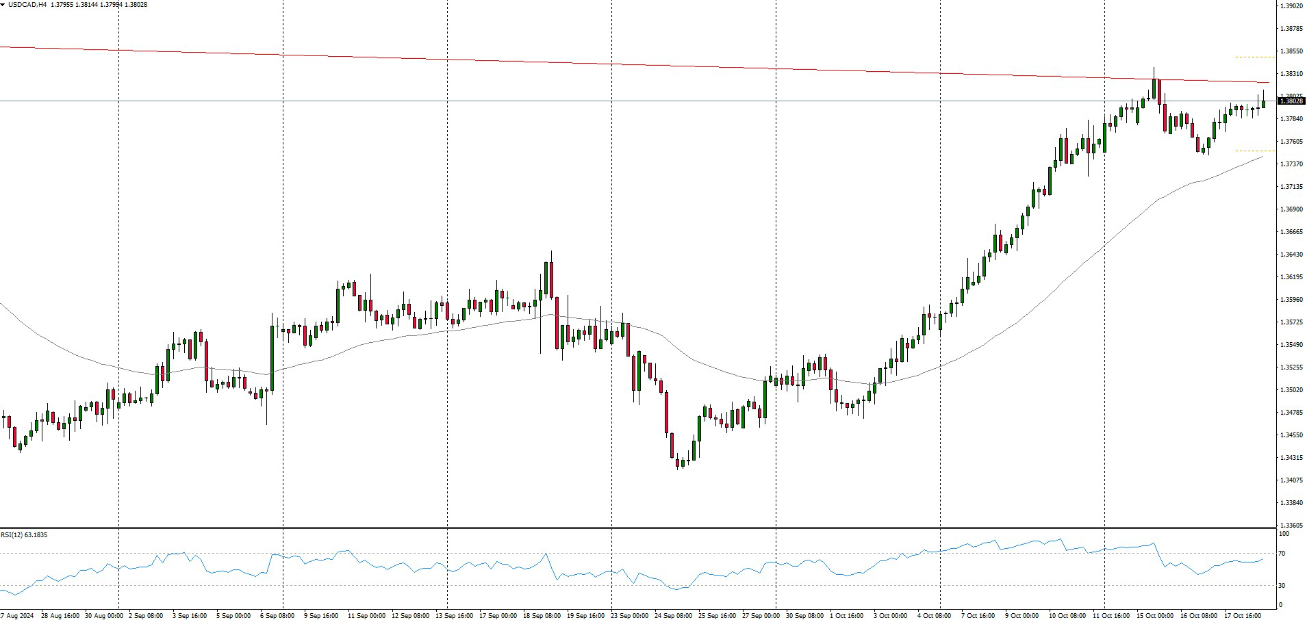 Tasso di interesse del Canada: Alle 15:45 CET di mercoledì 23 ottobre 2024, la Banca del Canada annuncerà il suo tasso di interesse, previsto al 3,75%. Ciò fa seguito a un taglio di 25 punti percentuali nel settembre 2024, che ha portato il tasso di riferimento al 4,25%, segnando la terza riduzione consecutiva di 25 punti percentuali dopo aver mantenuto un tasso terminale del 5% per 10 mesi durante il ciclo di rialzo. L’USDCAD è pronta per un potenziale breakout al rialzo della linea di tendenza al ribasso a 1,3837 sul grafico a 4 ore.