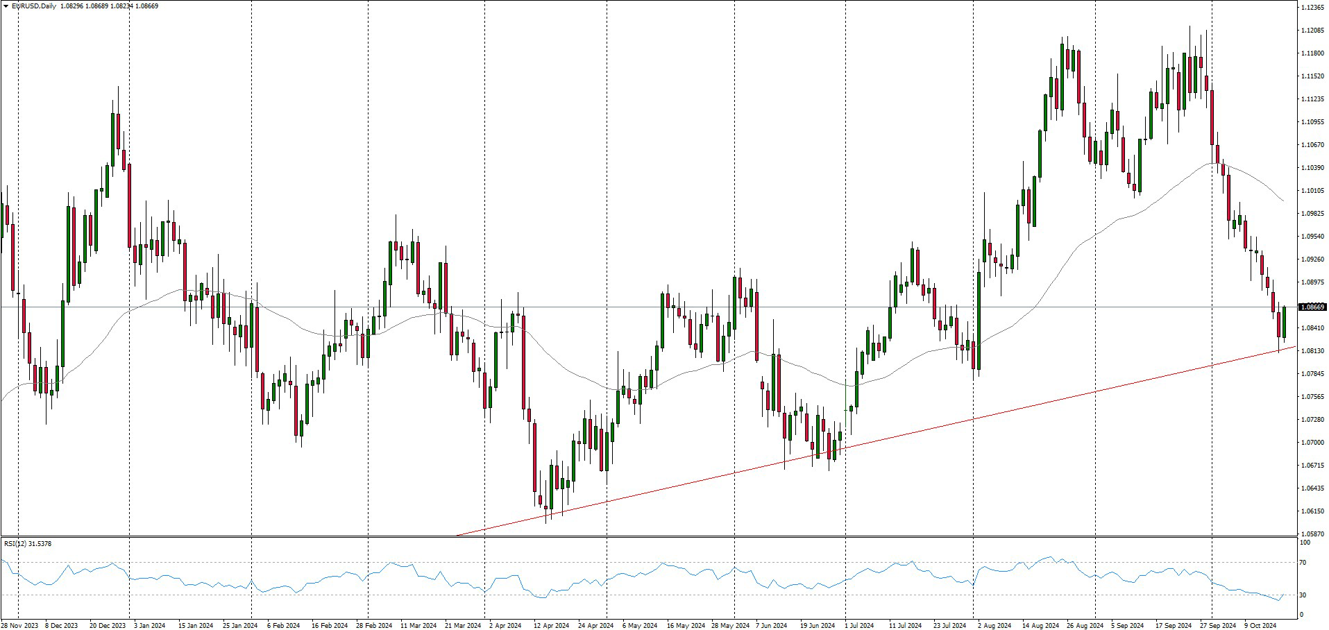 PMI manifatturiero dell’Eurozona: giovedì 24 ottobre 2024, alle ore 9:30 CET, è previsto l’annuncio del PMI manifatturiero dell’Eurozona a 40,7. Il PMI di settembre 2024 è stato rivisto leggermente al ribasso a 40,3 da un preliminare di 42,4, in calo rispetto al 42,1 dei due mesi precedenti. Sul grafico giornaliero di EURUSD si osserva un potenziale rifiuto della tendenza rialzista a 1,0812.