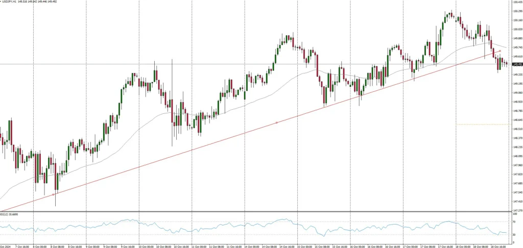 PMI manifatturiero degli Stati Uniti: giovedì 24 ottobre 2024, alle 15:45 CET, è previsto il PMI manifatturiero degli Stati Uniti S&P Global a 47,5. Il PMI di settembre 2024 è stato rivisto a 47,3 da un preliminare di 47,0, segnando il livello più basso da giugno 2023. Un potenziale breakout al ribasso della linea di tendenza al rialzo è identificato nel grafico a 1 ora dell’USDJPY a 149,51.