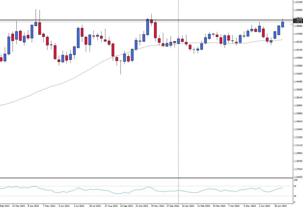 Secondo il grafico settimanale, il mercato è riuscito a salire vicino alla zona di 1,5000, dove ora si trova una forte resistenza. Per il momento potrebbe esserci un leggero potenziale a favore del CAD. La decisione sui tassi di interesse si terrà mercoledì 24 luglio alle 15:45 CET.