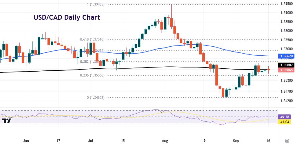 AUD moved higher even on the back of disappointing China data over the weekend. It showed China’s industrial output growth slowed to a five-month low in August, while retail sales and new home prices weakened further, bolstering the case for aggressive stimulus to shore up the economy and help it hit its annual growth target. USD/CAD again traded around the 200-day SMA at 1.3588 in a relatively narrow range. The 38.2% Fib level of the August drop is at 1.3631.